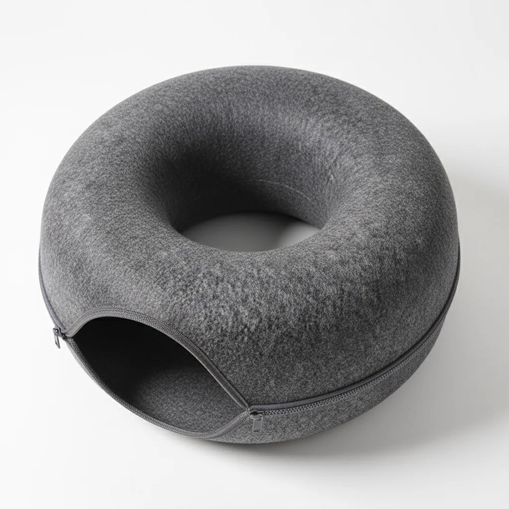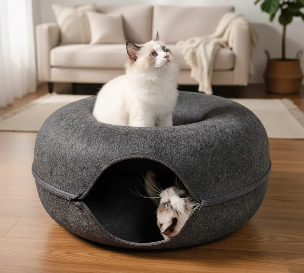A cozy donut-shaped bed that also works as a playful tunnel. Cats can nap inside or run through for fun, making it perfect for two pets while saving space at home.